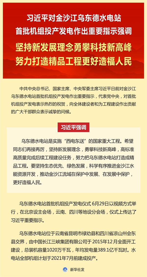 新華社:習近平對金沙江烏東德水電站首批機組投產發電作出重要指示強調