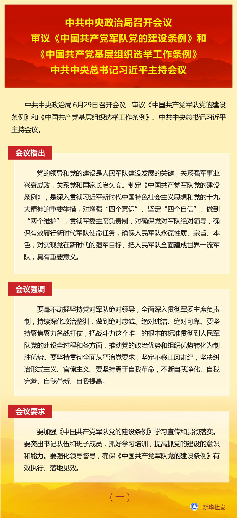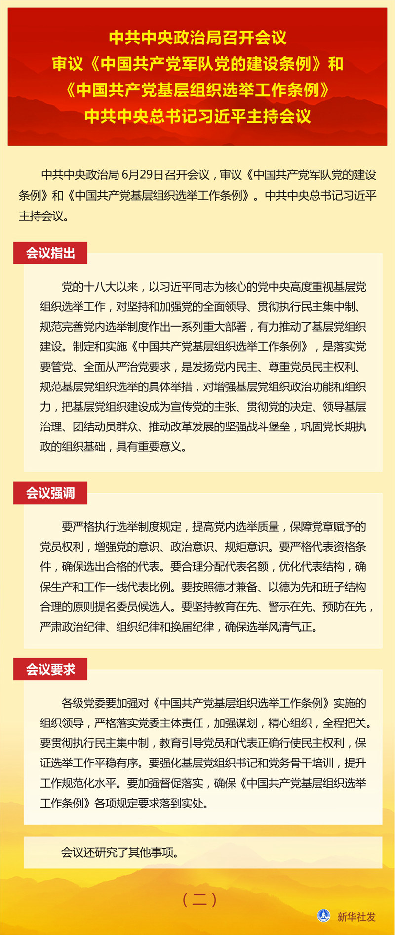 新華社北京6月29日電  中共中央政治局6月29日召開會議,審議《中國共產黨軍隊黨的建設條例》和《中國共產黨基層組織選舉工作條例》。中共中央總書記習近平主持會議。