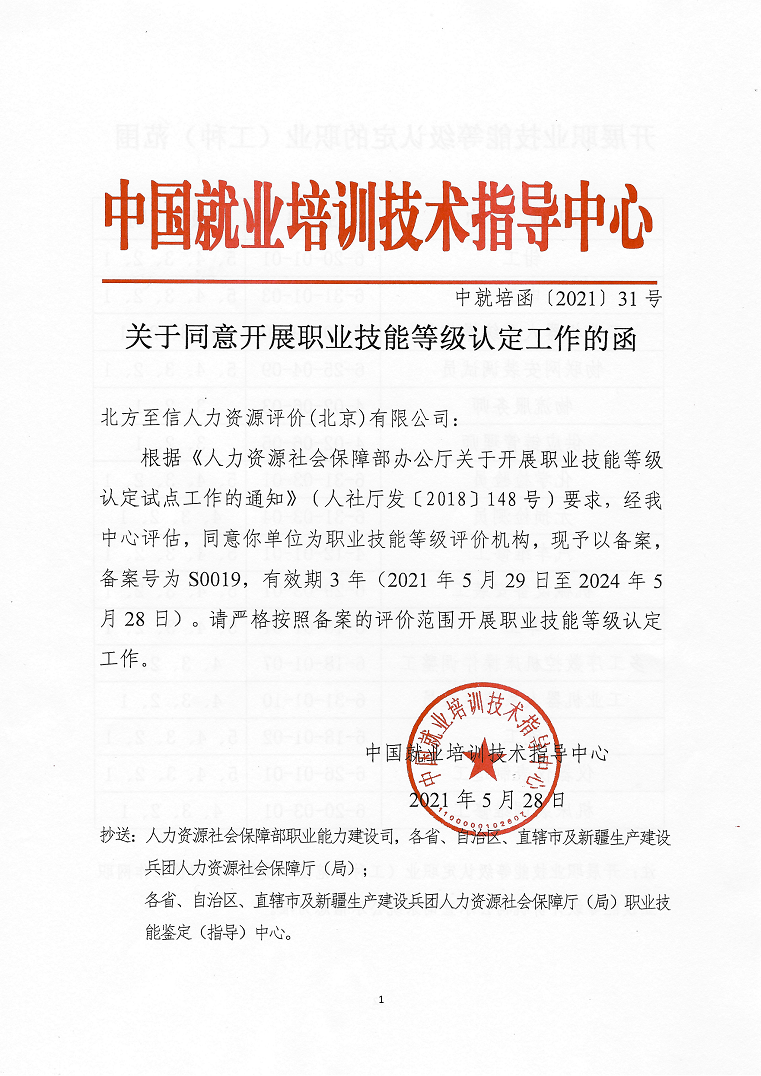 5月28日,人力資源社會保障部中國就業培訓技術指導中心發布了《關于同意開展職業技能等級認定工作的函》(中就培函〔2021〕31號),北方至信人力資源評價(北京)有限公司(以下簡稱“北方至信”)成為首家央企全國性社會培訓評價組織職業技能等級認定機構。