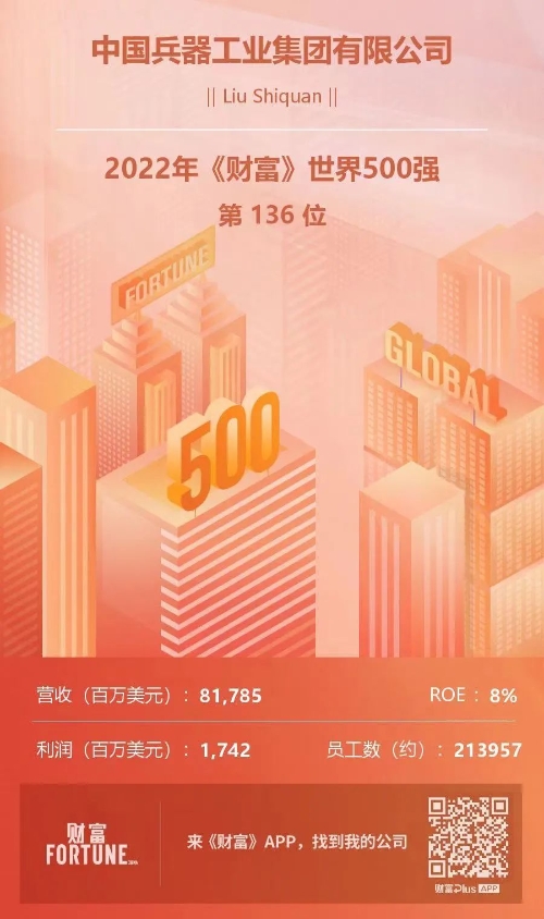 兵器工業(yè)集團位列2022年《財富》世界500強第136位